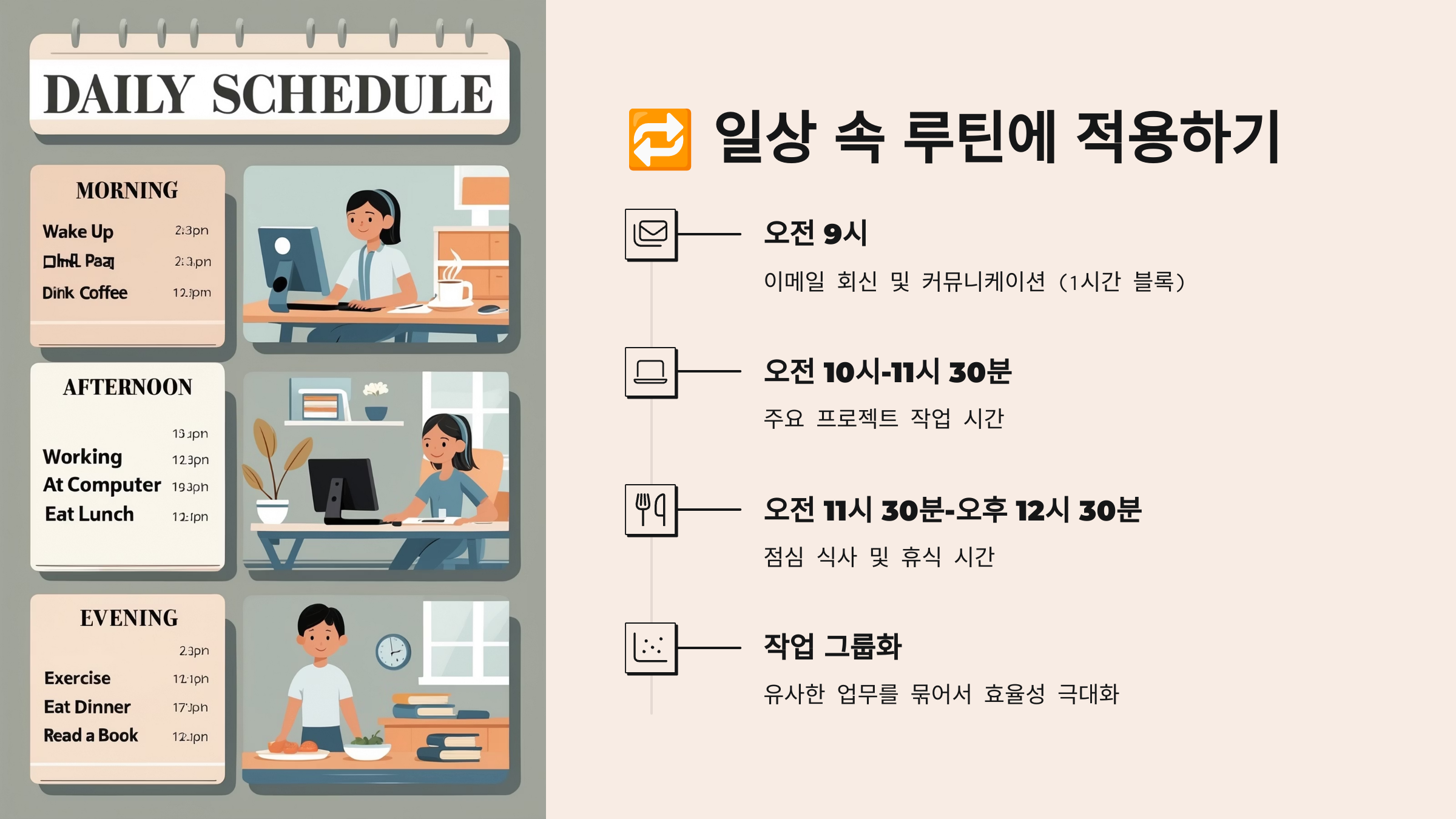 예를 들어 아침 8시부터 9시까지는 이메일 확인, 9시부터 11시까지는 기획 업무, 11시부터 12시는 회의, 이런 식으로 하루 전체를 미리 구성하는 거예요. 시간을 명확히 나눠두기 때문에 불필요한 선택 피로가 줄고, 집중력이 올라가요.