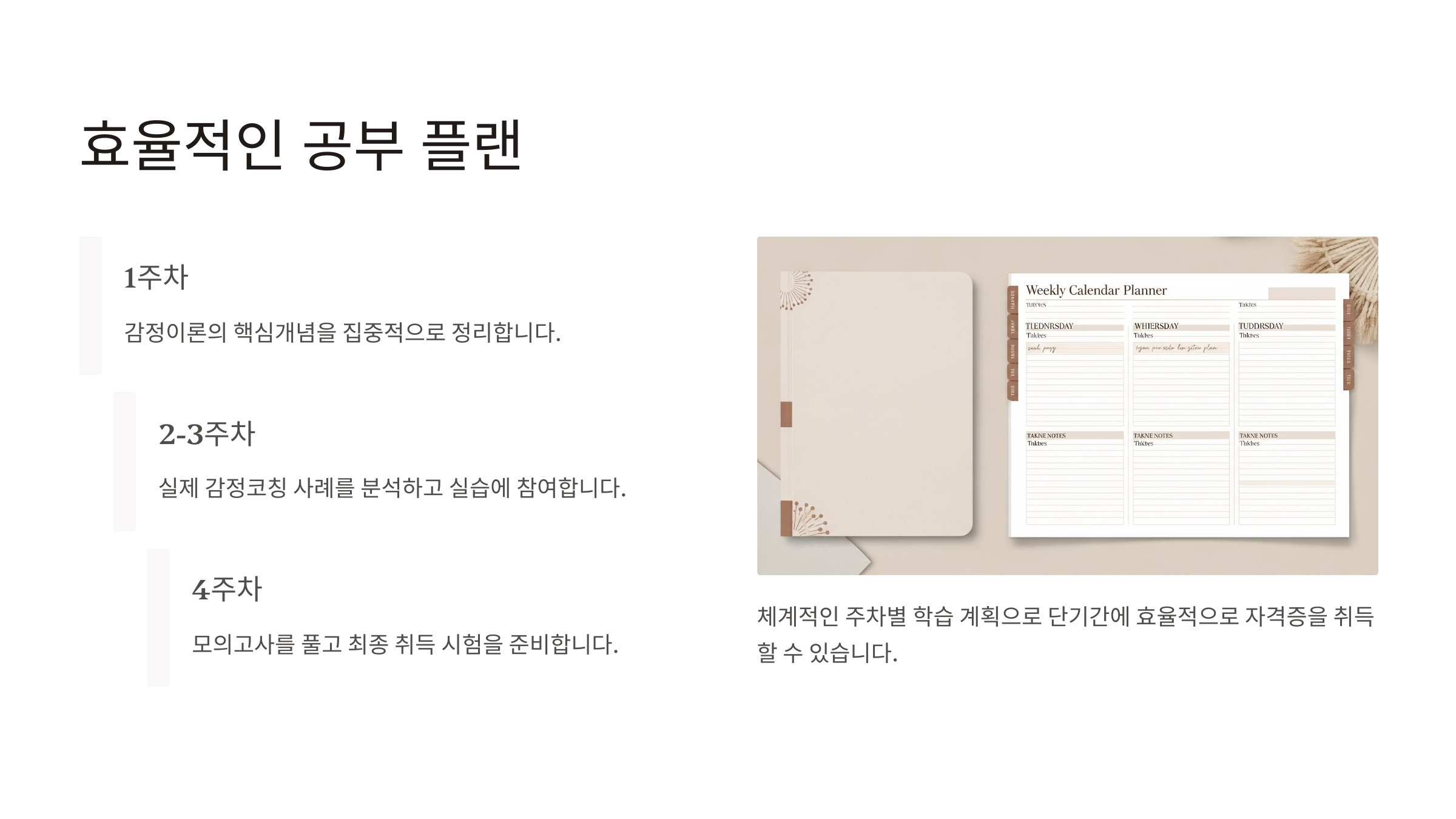 감정코칭자격증을 한 달 안에 취득하려면, 막연한 학습보다는 체계적인 계획이 필수예요. 목표와 일정을 정확히 세우고, 그에 따라 매일 어떤 공부를 할지 정리하는 게 가장 중요하죠. 📆