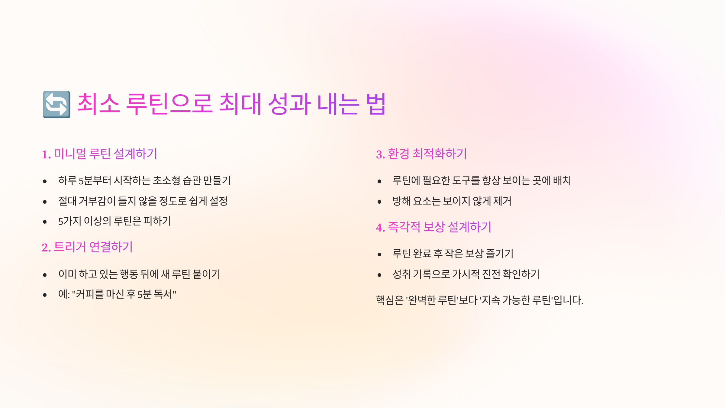 루틴이라고 해서 거창할 필요는 없어요. 오히려 최소 루틴이야말로 꾸준히 실천할 수 있는 핵심이에요. 성공한 사람들 대부분은 ‘단순한 습관 하나’를 수년간 반복했어요. 아침 일기, 매일 같은 시간 산책, 5분 독서처럼 말이에요.