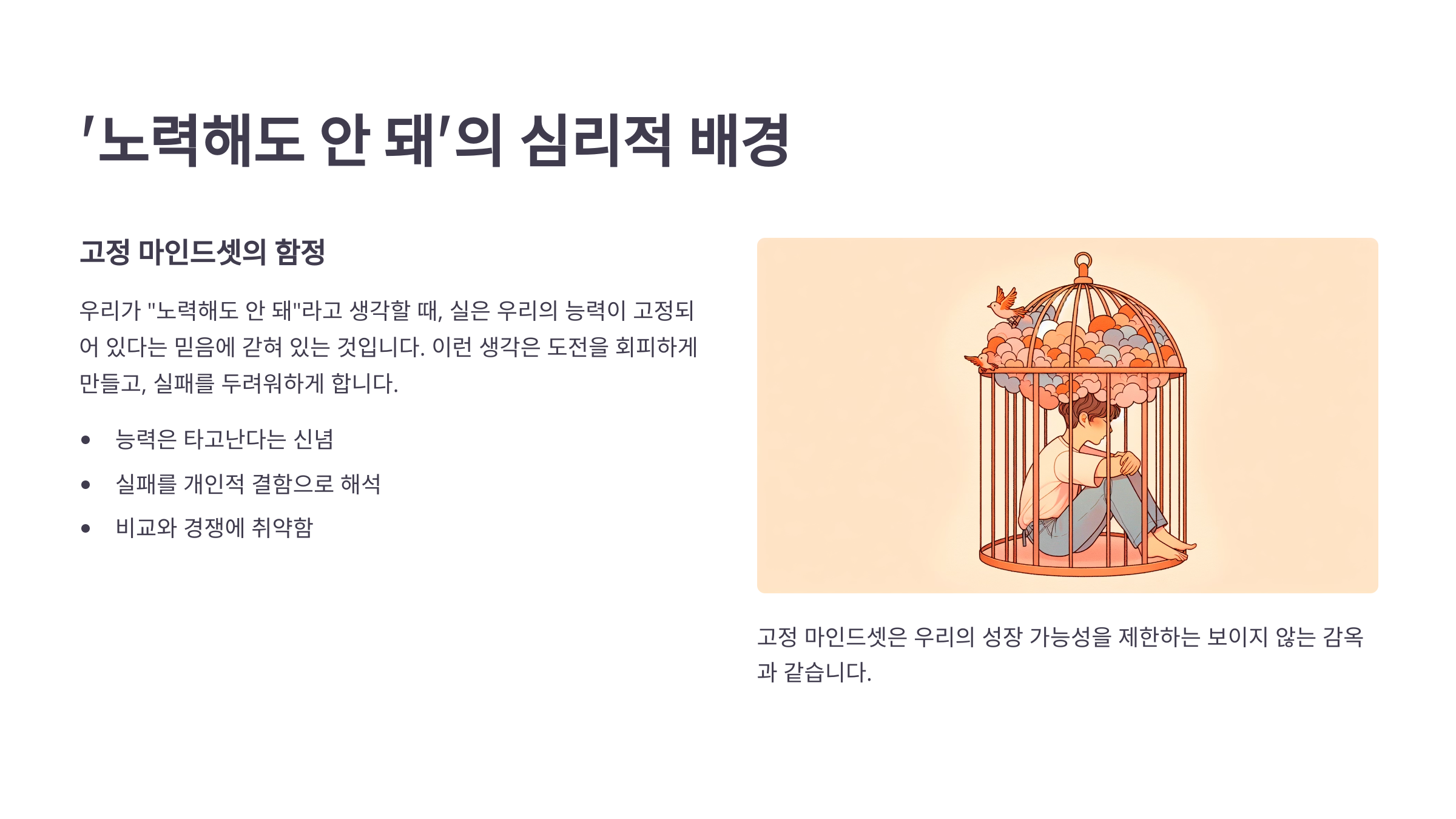 이때 뇌는 실수를 피하기 위해 도전 자체를 회피하게 돼요. 특히 어린 시절, 실패에 대한 비난을 자주 받았다면 더 쉽게 고정 마인드셋으로 굳어질 수 있어요. 그래서 스스로를 "안 되는 사람"으로 규정하게 되는 거죠.