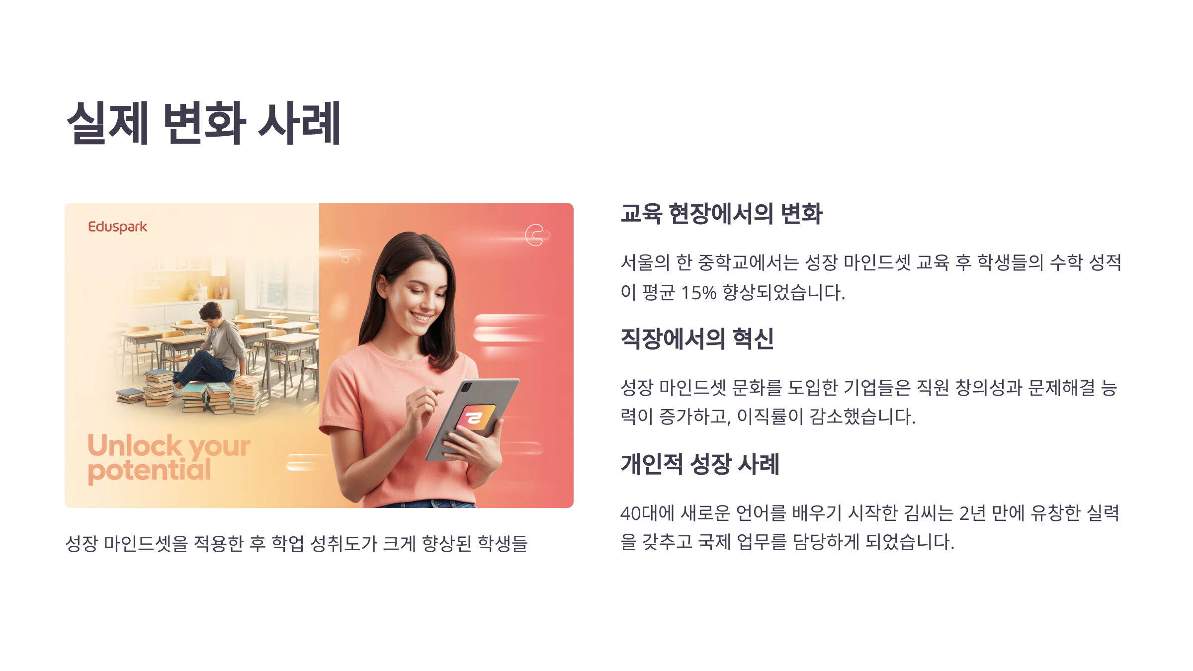 이처럼 평범한 사람도 성장 마인드셋을 실천함으로써 놀라운 변화를 만들 수 있어요. 핵심은 한 번의 성공이 아니라, 계속 성장하는 태도에 있다는 걸 기억해요.