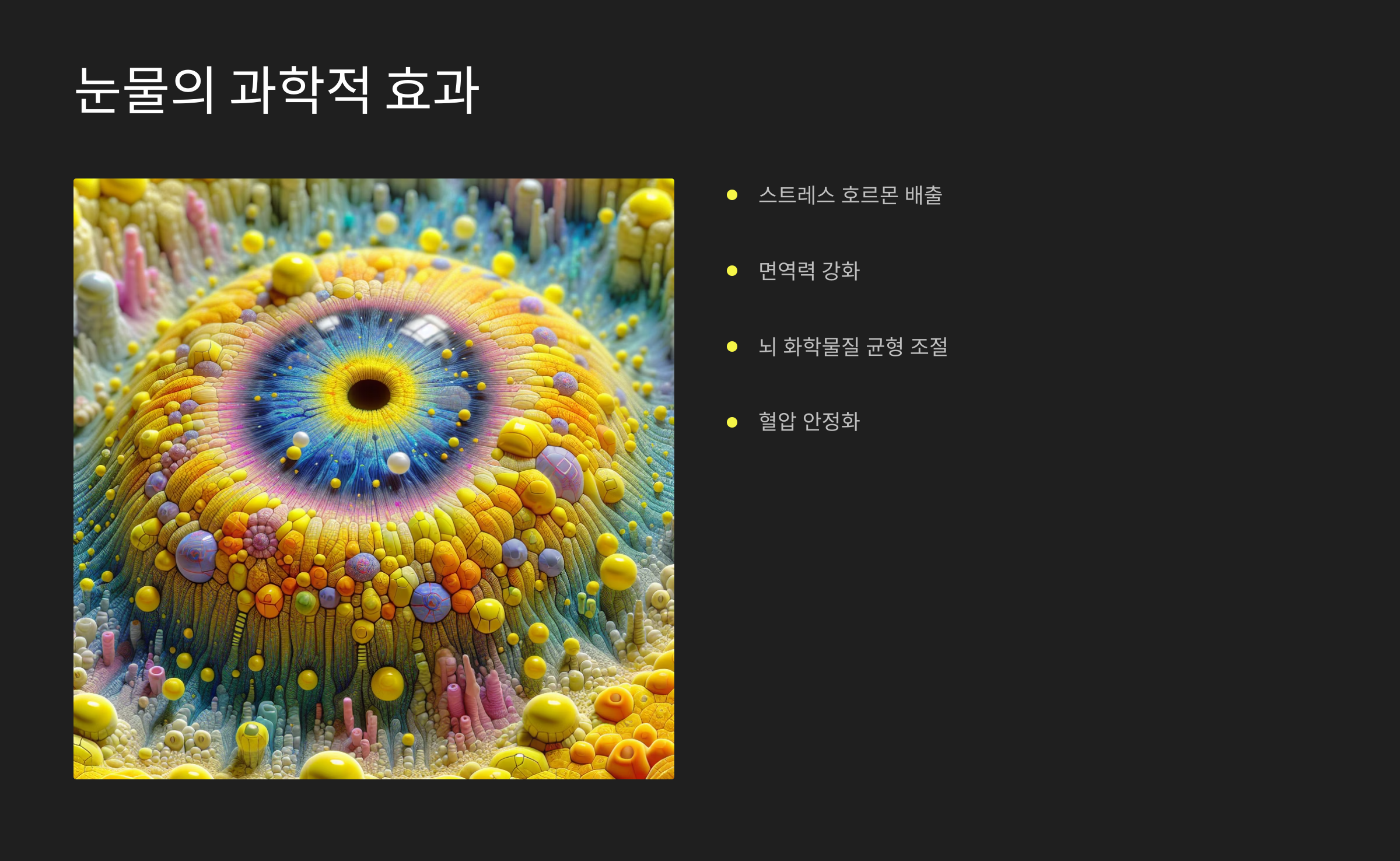 | 감정 눈물 | 호르몬, 엔도르핀 | 감정 해소, 스트레스 완화 |