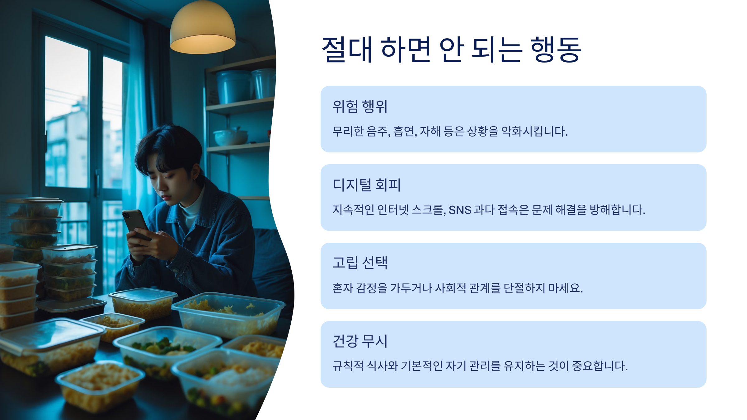 멘탈이 무너졌을 때, 무심코 하게 되는 행동 중 일부는 오히려 상황을 악화시킬 수 있어요. 아래 행동들은 피해야 해요!