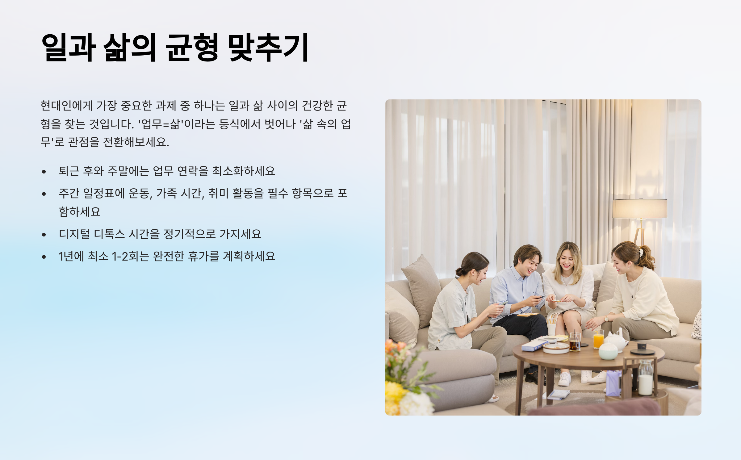일과 삶의 균형을 위해 꼭 필요한 건 '기준 정하기'예요. 예를 들어, “주말은 무조건 가족과 보내기”, “저녁 8시 이후엔 업무 금지”처럼 나만의 룰을 만드는 거죠. 이 작은 원칙이 생각보다 큰 변화를 만들어요.