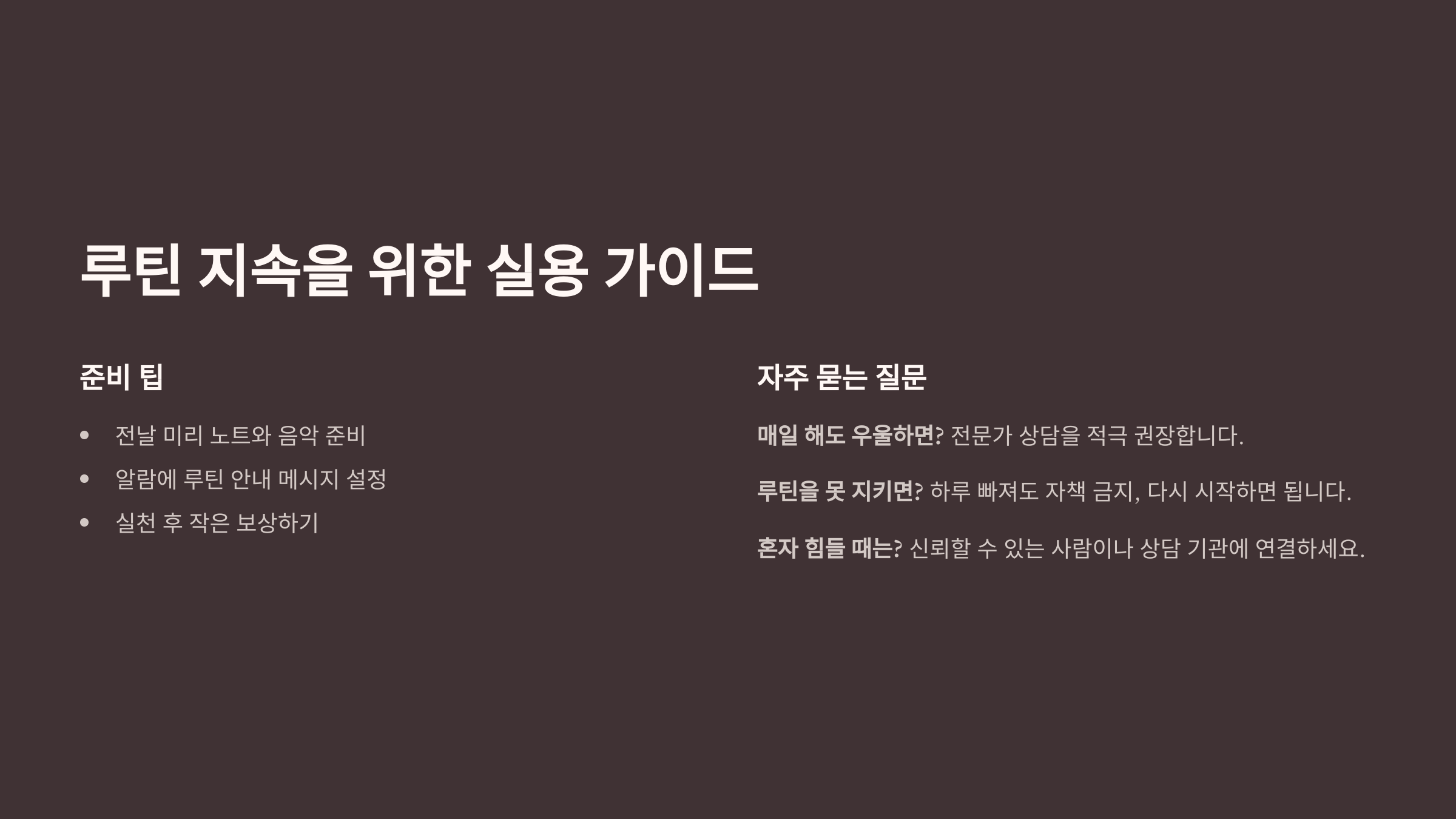 이렇게 정돈된 루틴을 매일 실천하다 보면, 감정의 파도가 조금씩 잔잔해지고, 불안도 사라지는 걸 느끼게 될 거예요.