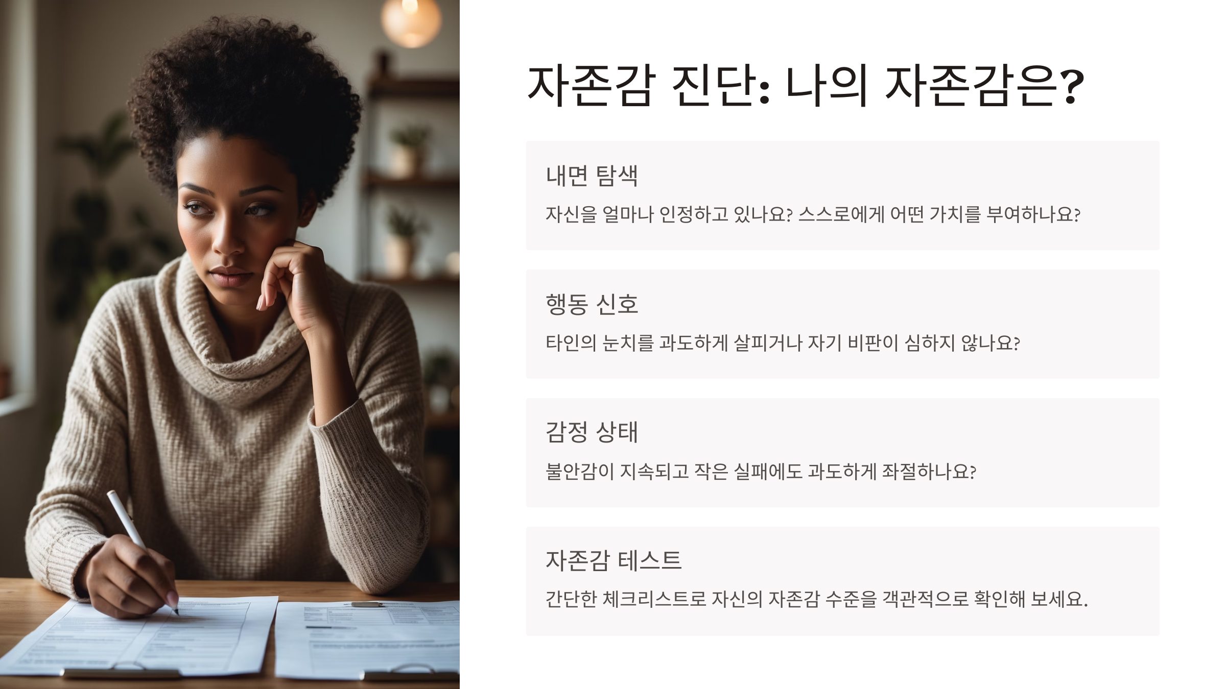 이제 내 자존감 상태를 가볍게 점검해 볼 차례예요! 자존감 진단은 나를 객관적으로 바라보고, 어떤 부분을 보완할지 파악하는 좋은 기회랍니다. 작은 체크리스트를 통해 지금의 마음 상태를 알아보면 좋아요.