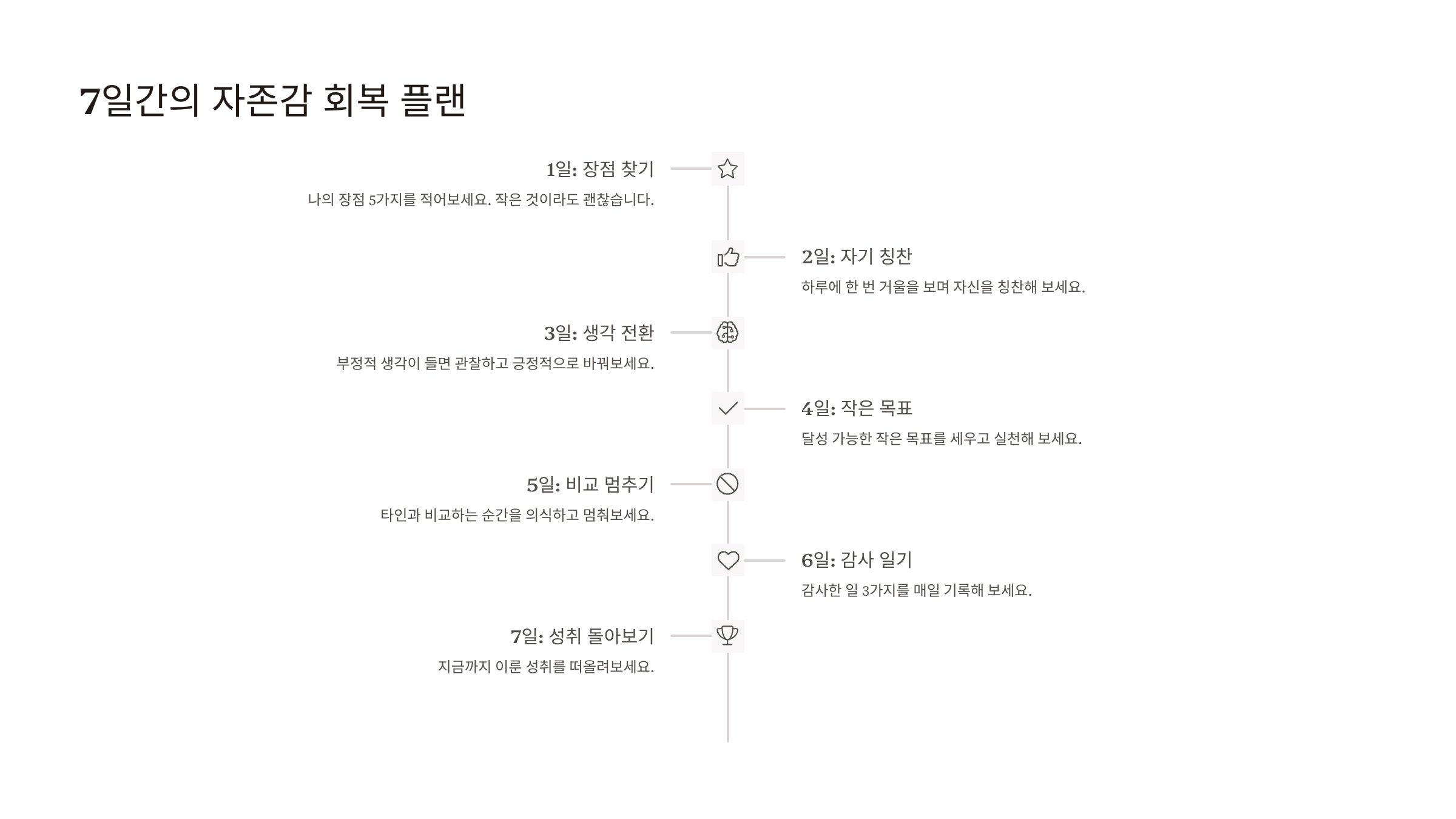 이 진단은 단지 ‘나의 현재’를 알려주는 지표일 뿐이에요. 자존감은 매일의 작은 노력으로 달라질 수 있답니다. 이제부터 나를 다시 세워가는 7일 회복 플랜을 함께 살펴보자구요!