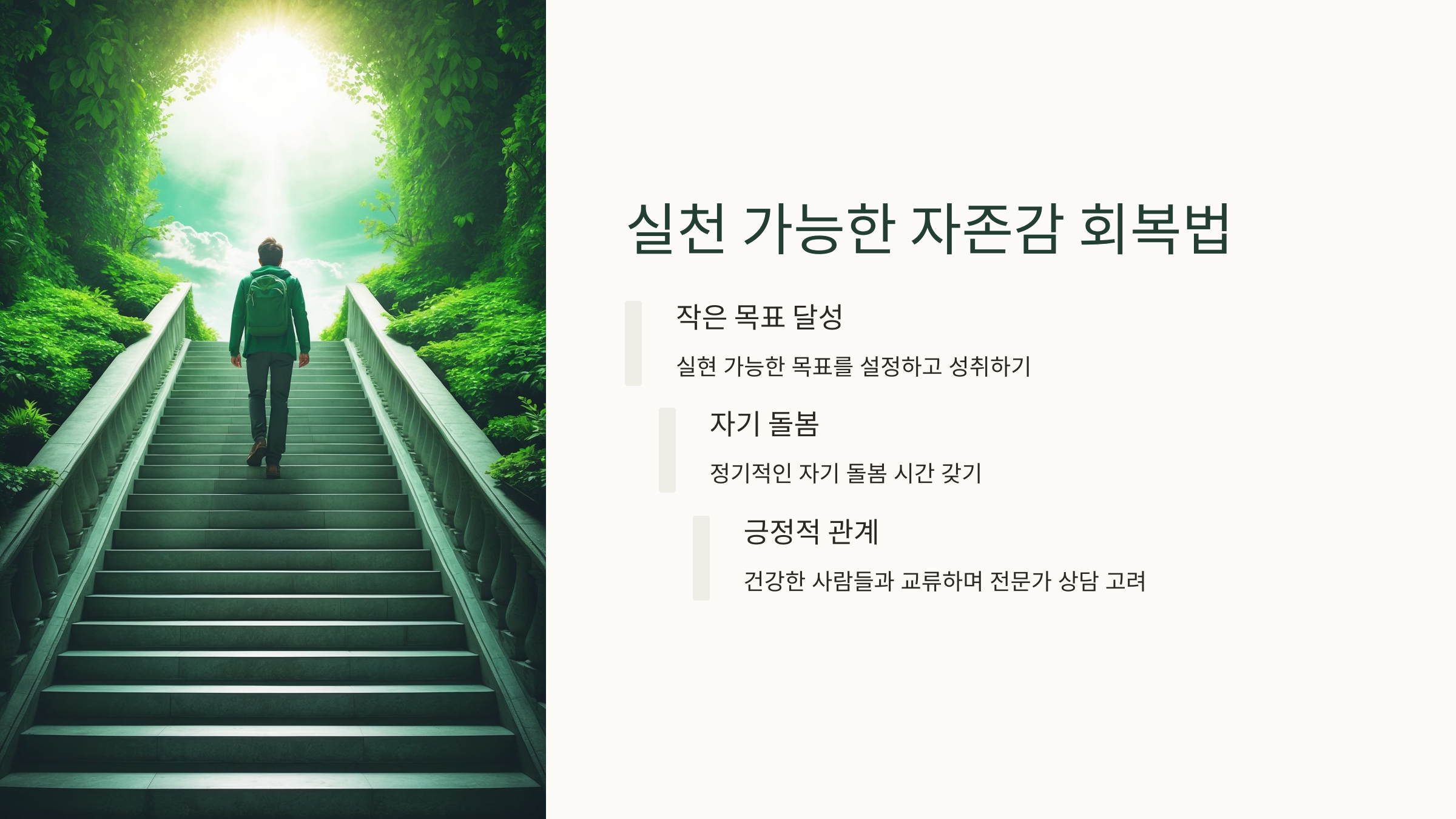 실천이 없으면 변화도 없어요. 그래서 자존감을 회복하고 싶다면 반드시 행동이 따라야 해요. 아래 다섯 가지 회복법은 간단하면서도 강력한 효과를 줘요.