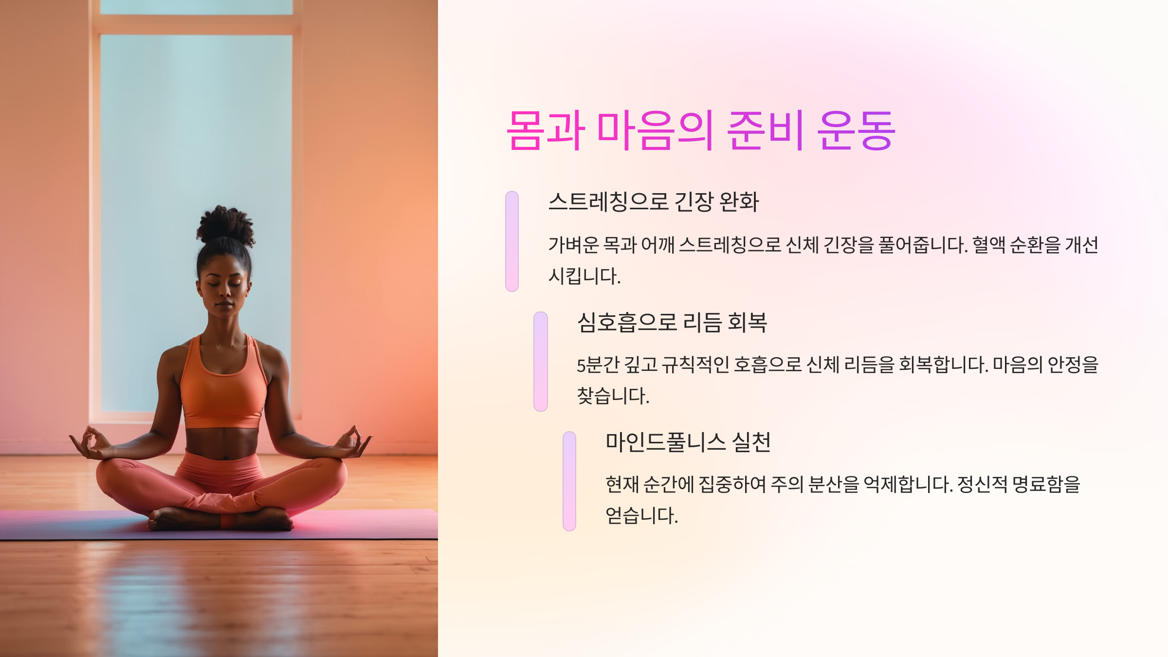 집중력은 단순히 머리만 쓰는 게 아니에요. 몸과 마음이 함께 준비되면 훨씬 더 좋아져요. 😊 가벼운 스트레칭이나 산책부터 시작해 보세요.