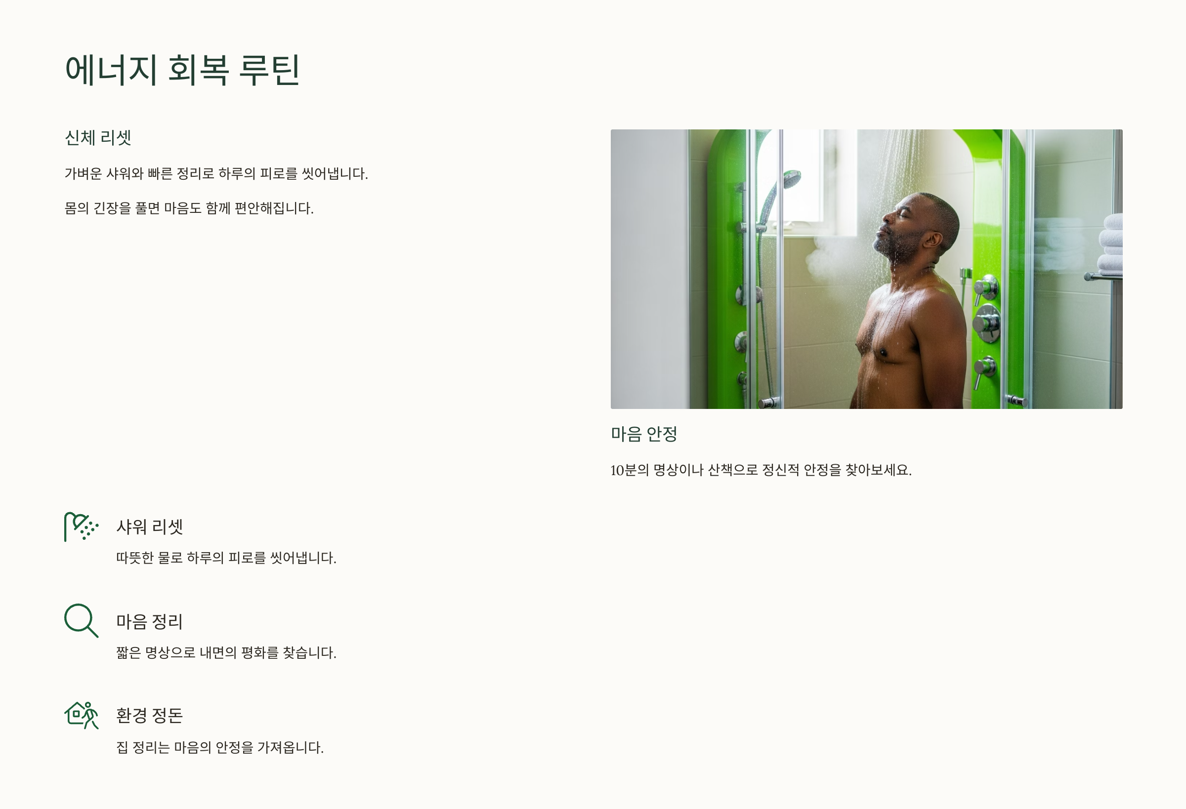 그래서 자기관리 루틴의 핵심 중 하나는 바로 ‘에너지 회복’이에요. 단순히 쉬는 것과는 달라요. 능동적인 회복 활동을 통해 몸과 뇌를 리프레시하는 게 중요하죠.