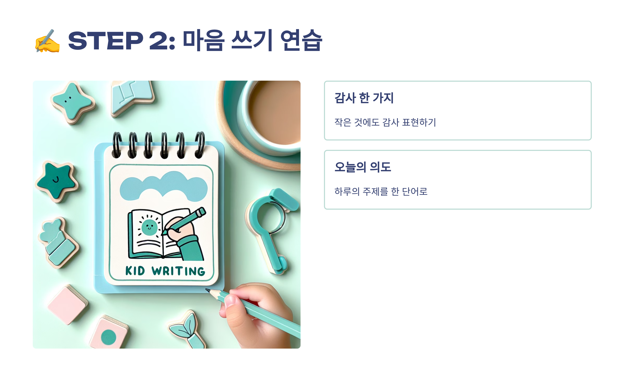 마음 쓰기 연습은 어려울 필요가 없어요. 단 한 문장이라도 괜찮아요. 예를 들어 “오늘 출근이 걱정돼” 또는 “기대 반 불안 반이야”처럼 솔직한 감정을 한 줄 적는 것부터 시작해보세요.
