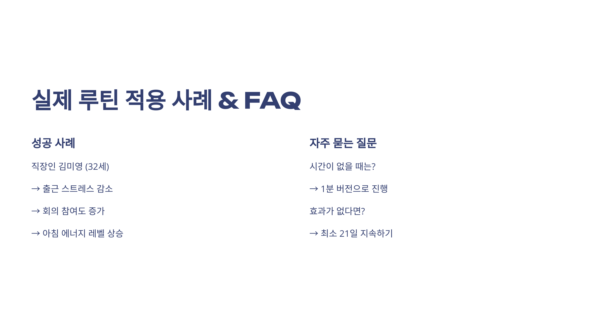 출근 전 이 루틴을 꾸준히 실천한 직장인 A씨의 사례를 보면, 한 달 만에 업무 스트레스는 물론 인간관계에서의 충돌 빈도까지 줄어들었다고 해요. 자기를 돌아보는 짧은 루틴이 장기적인 삶의 질까지 바꾼 셈이죠.
