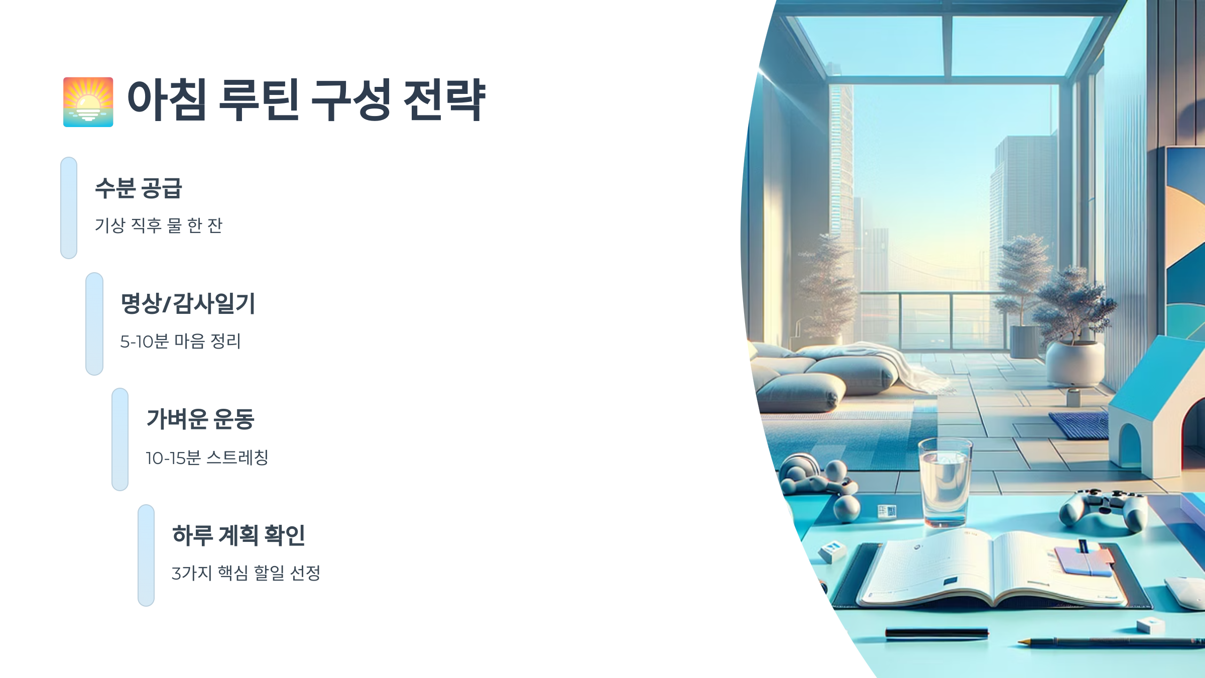 기억할 점은 **너무 완벽하게 짜지 말 것!** 처음부터 7단계 루틴을 만들면 금방 지쳐요. 간단한 3단계 루틴부터 시작해서 차차 확장하는 게 좋아요. 아침은 유연하면서도 집중된 시간이 되어야 해요 🌞