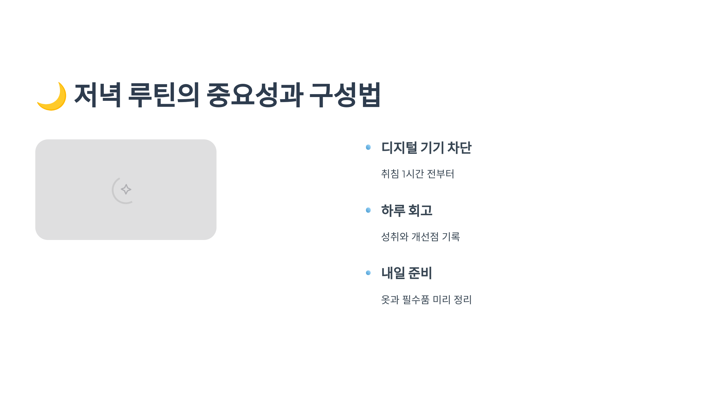 핵심은 **뇌를 차분하게 만드는 것**이에요. 뇌가 각성된 상태에서는 수면 호르몬인 멜라토닌이 잘 분비되지 않기 때문에, 자기 전 최소 1시간 전부터는 자극적인 활동을 줄이는 게 좋아요. 스마트폰, 뉴스, 과한 대화는 모두 잠을 방해하는 요소예요.