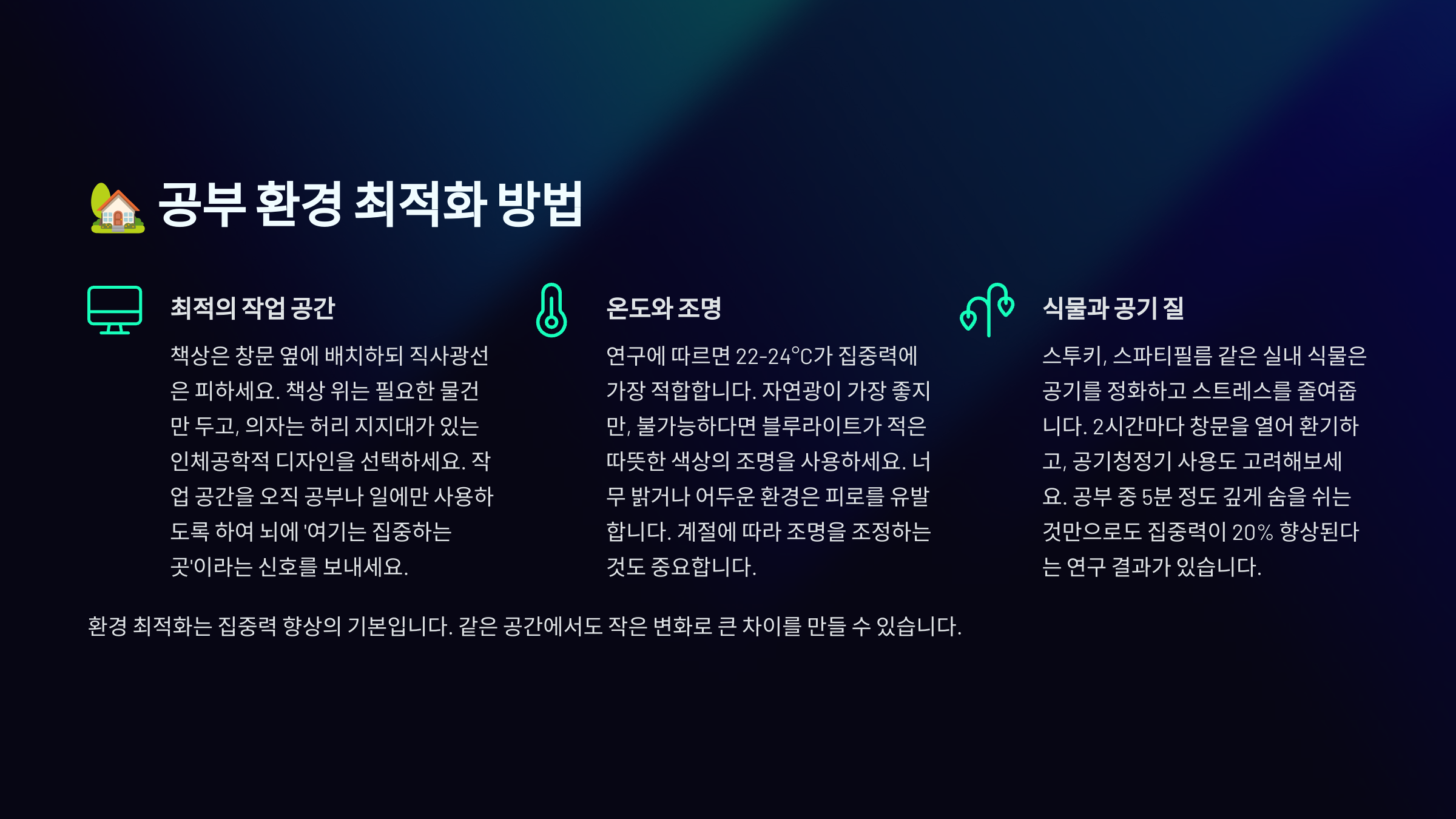 이제 집중력을 높이는 실질적인 방법으로 넘어가볼까요? 뇌가 더 잘 집중할 수 있도록 도와주는 환경부터 세팅해볼 거예요!