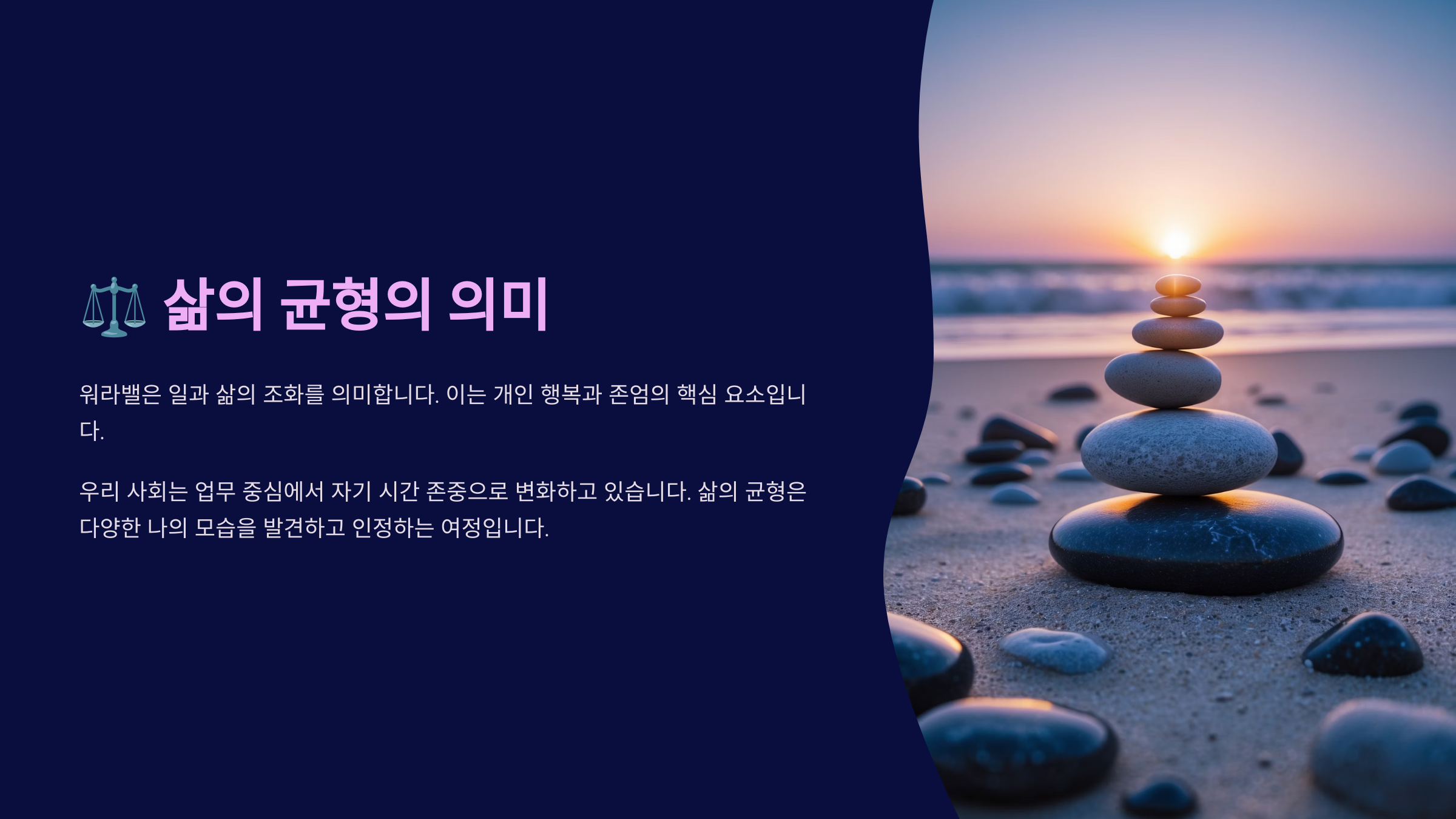 삶의 균형은 단순히 시간을 나누는 것 이상의 의미를 지녀요. 우리가 건강, 일, 가족, 친구, 자기계발을 적절히 나누어 관리할 때 진정한 균형을 이룬답니다. 흔히 ‘워라밸’이라는 단어로 표현되기도 하지만, 여기서 말하는 균형은 훨씬 더 포괄적인 개념이에요.