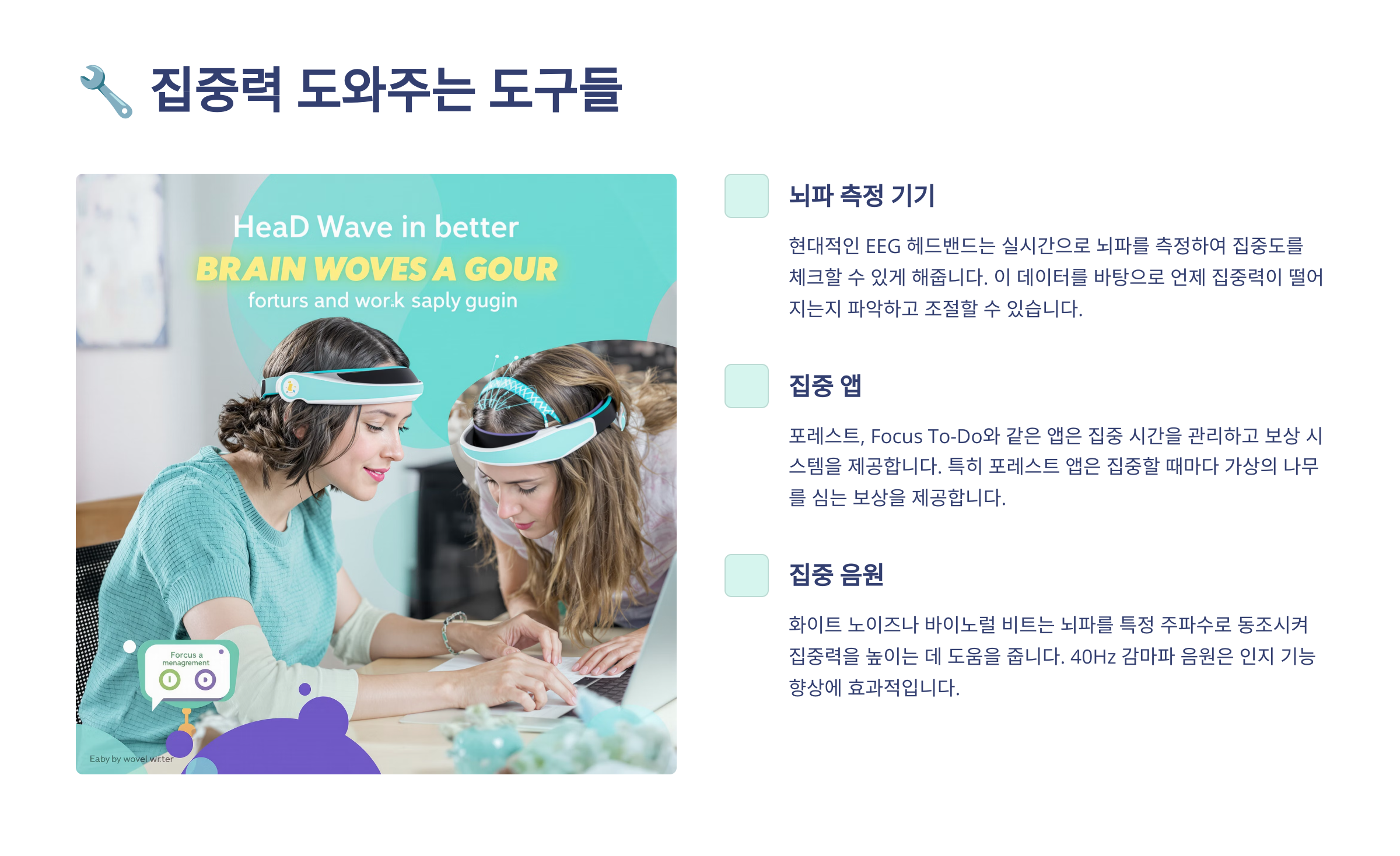 | 뉴로피드백 기기 | 뇌파 분석 실시간 훈련 | 과학적 집중력 개선 |